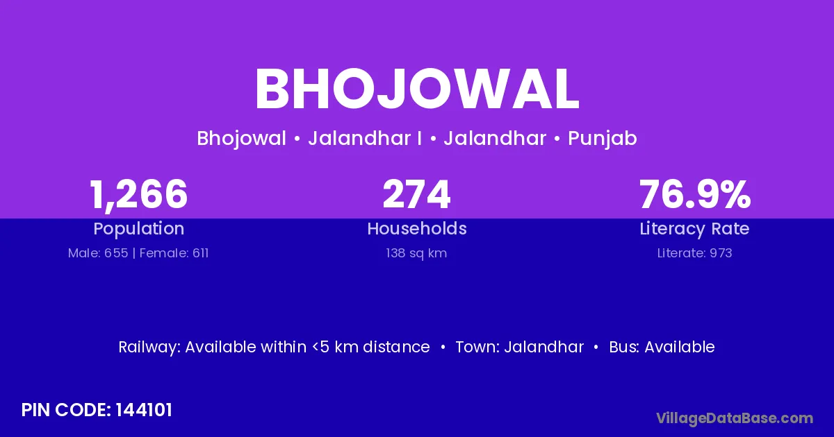 Bhojowal village has a total population of 1,266 people, of which 655 are males and 611 are females.