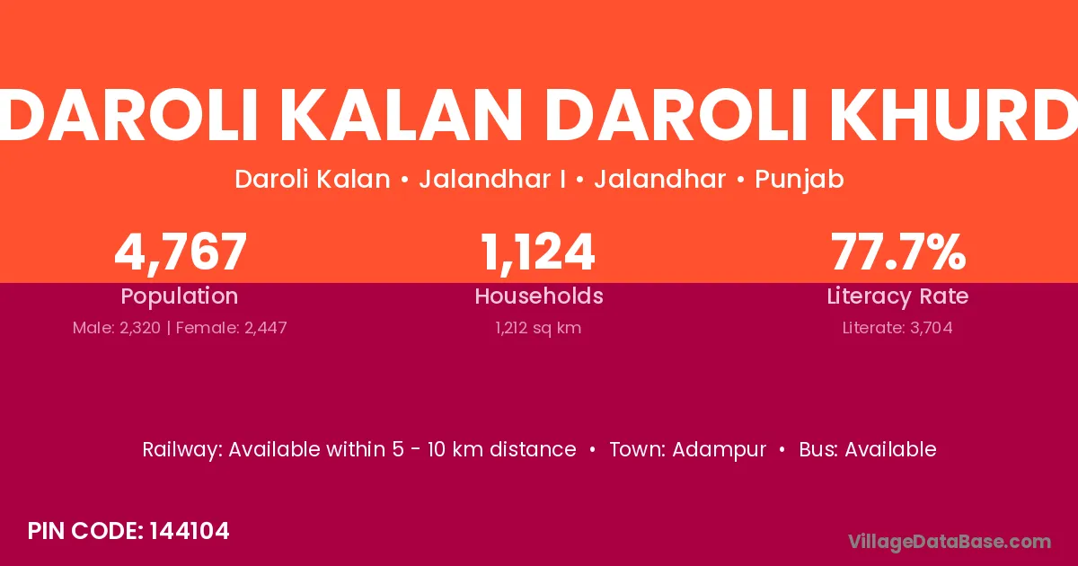 According to Census 2011 information, the village code of Daroli Kalan Daroli Khurd village is 144104.