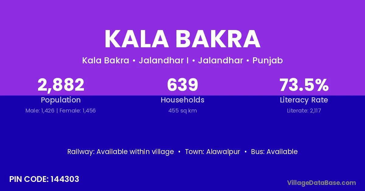 According to Census 2011 information, the village code of Kala Bakra village is 144303.
