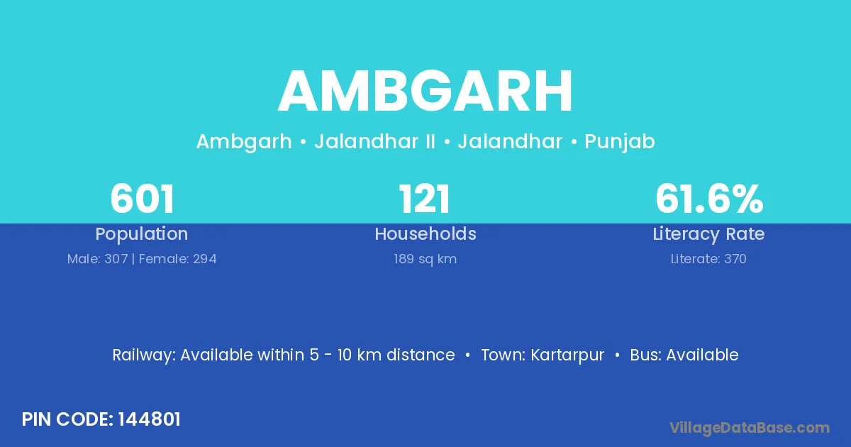 According to Census 2011 information, the village code of Ambgarh village is 144801.