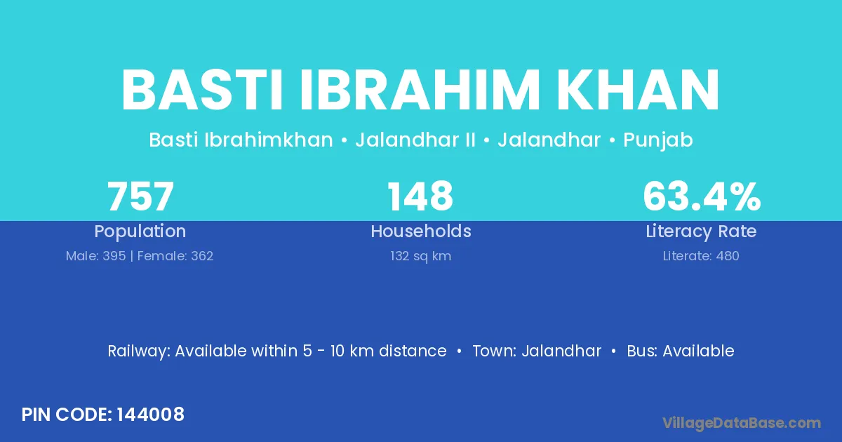 Basti Ibrahim Khan village has a total population of 757 people, of which 395 are males and 362 are females.