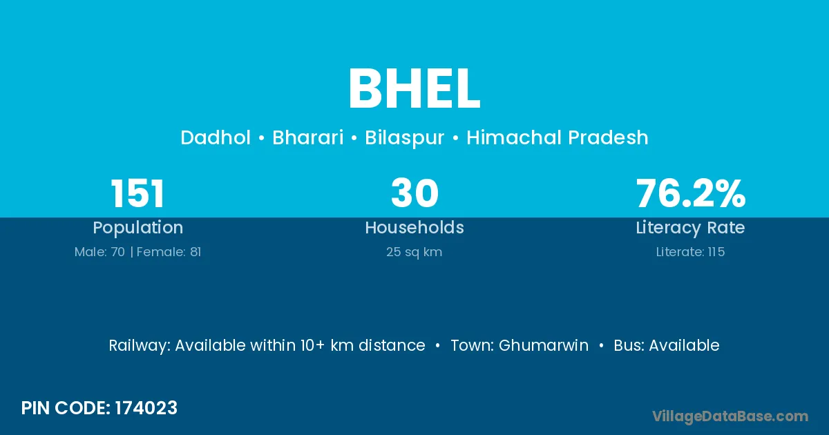 The literacy rate of Bhel village is 80.62%. Male literacy stands at 85.13% and female literacy at 75.77%.