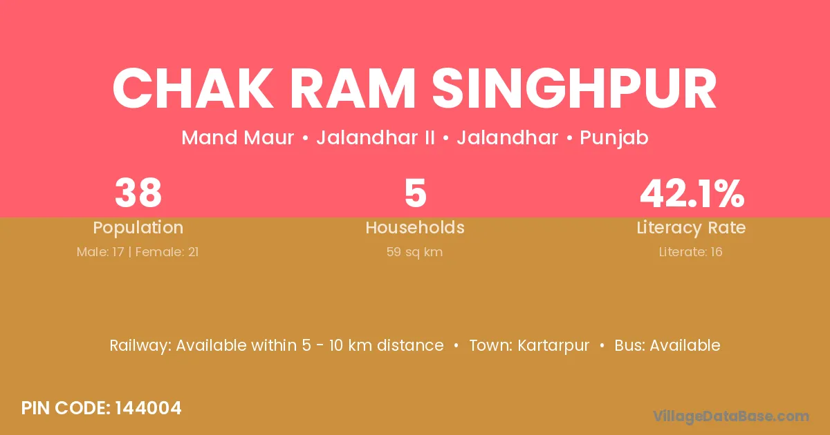 Chak Ram Singhpur village has a total population of 38 people, of which 17 are males and 21 are females.