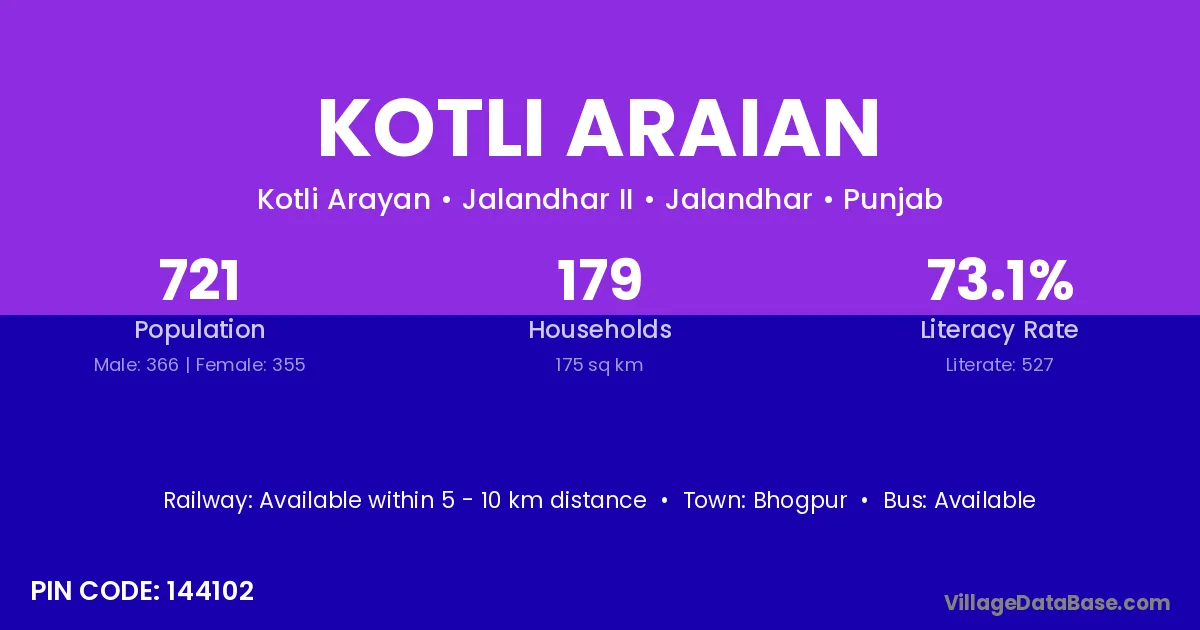 Kotli Araian village has a total population of 721 people, of which 366 are males and 355 are females.