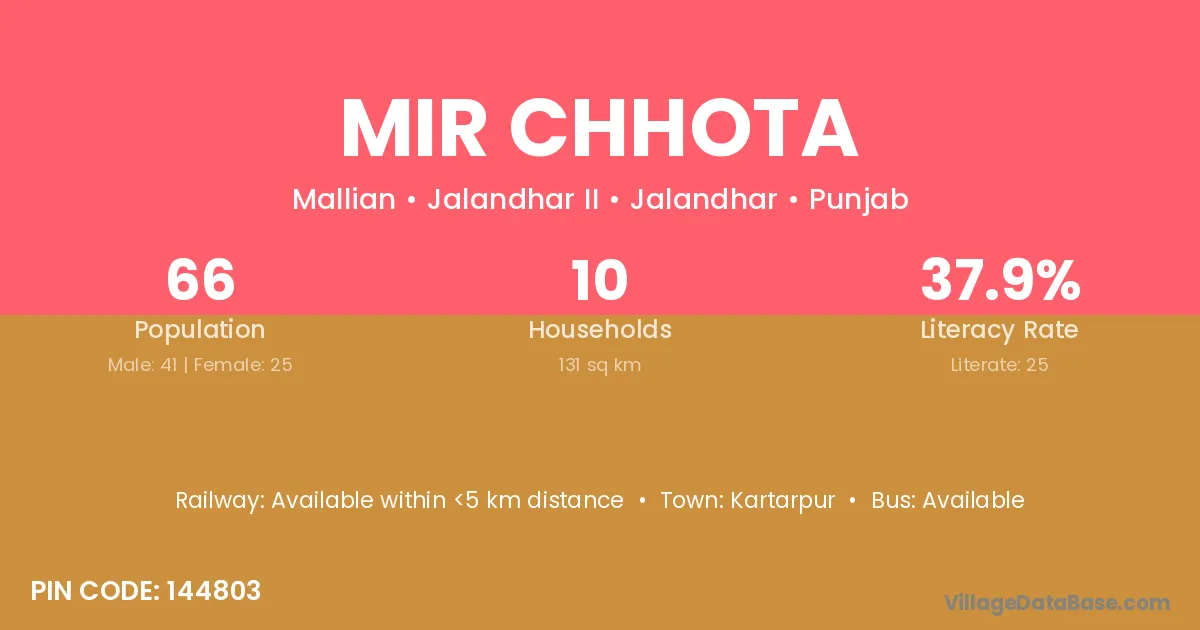 Mir Chhota village has a total population of 66 people, of which 41 are males and 25 are females.