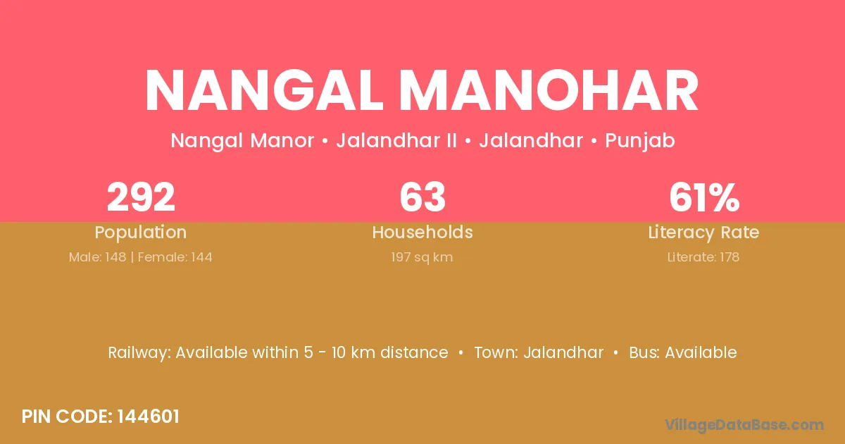 Nangal Manohar village has a total population of 292 people, of which 148 are males and 144 are females.