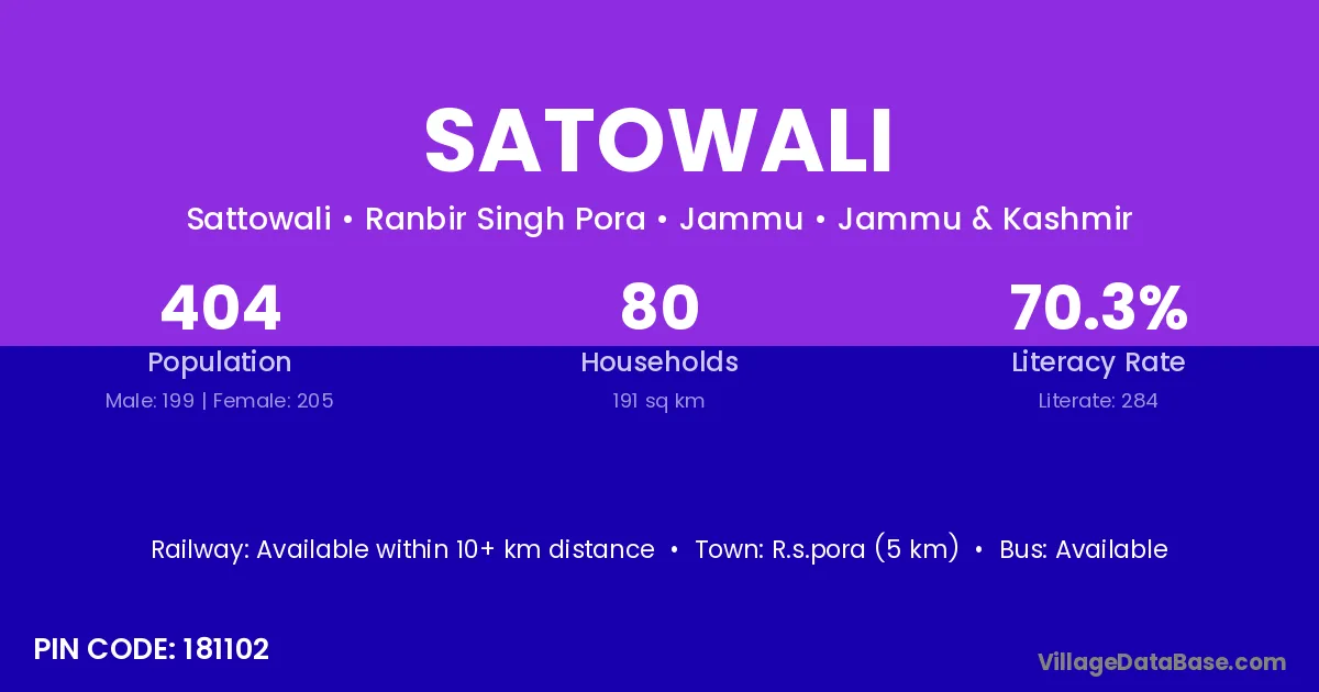 The literacy rate of Satowali village is 77.81%. Male literacy stands at 84.60% and female literacy at 70.26%.