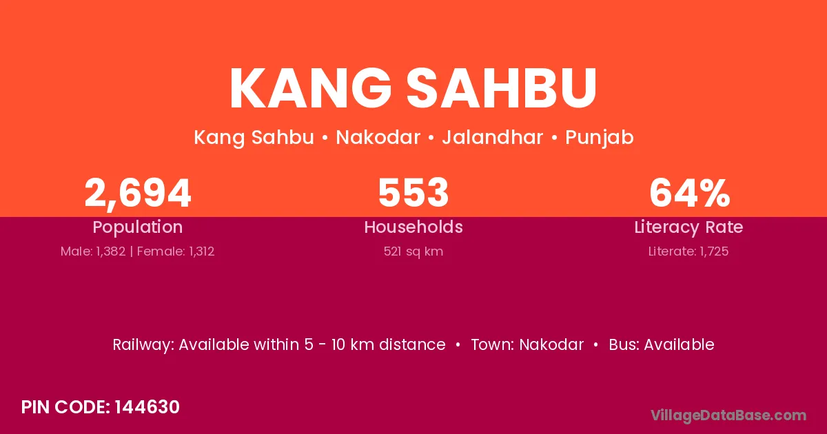 Kang Sahbu village has a total population of 2,694 people, of which 1,382 are males and 1,312 are females.