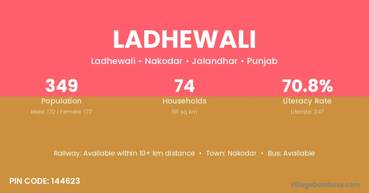 Ladhewali village has a total population of 349 people, of which 172 are males and 177 are females.