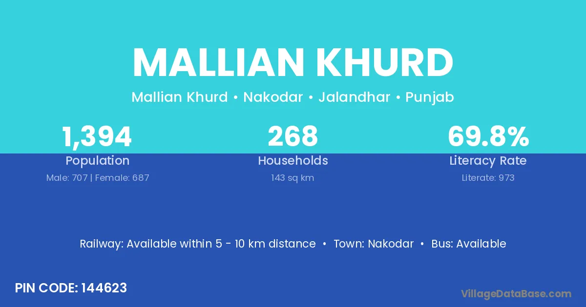 Mallian Khurd village has a total population of 1,394 people, of which 707 are males and 687 are females.