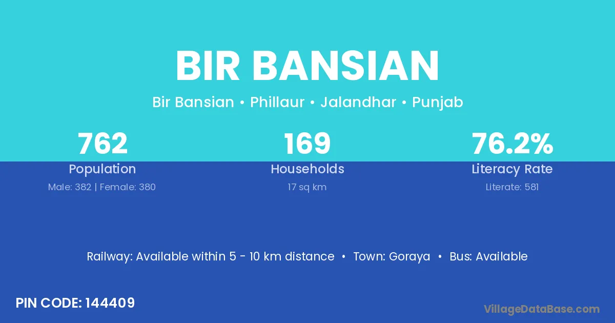 Bir Bansian village has a total population of 762 people, of which 382 are males and 380 are females.