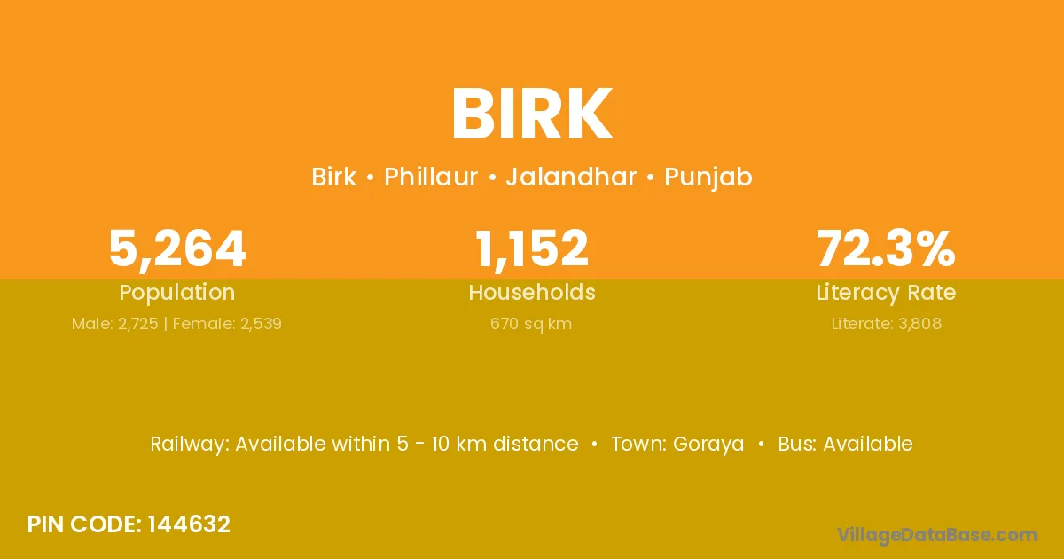 Birk village has a total population of 5,264 people, of which 2,725 are males and 2,539 are females.