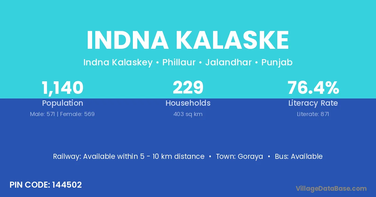 Indna Kalaske village has a total population of 1,140 people, of which 571 are males and 569 are females.