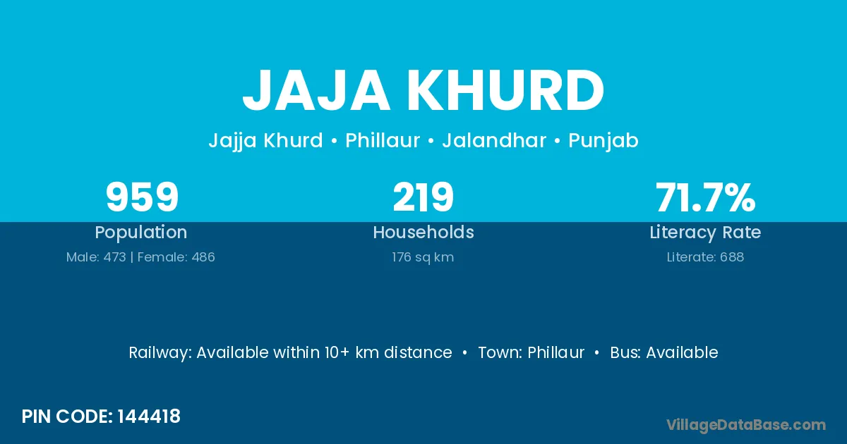 Jaja Khurd village has a total population of 959 people, of which 473 are males and 486 are females.