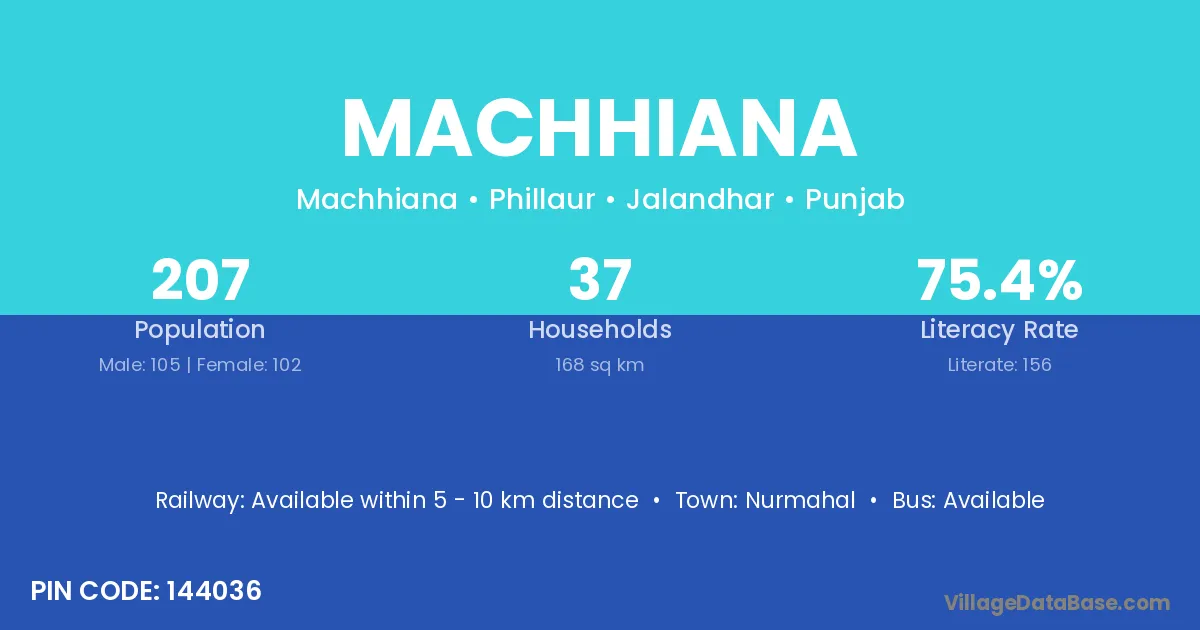 Machhiana village has a total population of 207 people, of which 105 are males and 102 are females.