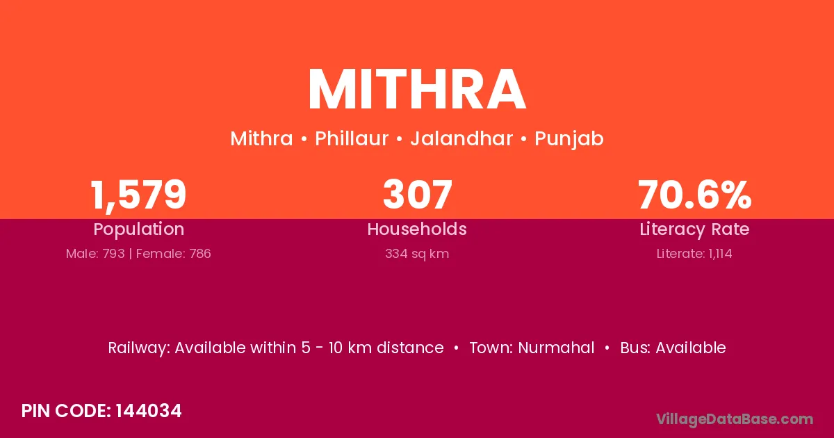 Mithra village has a total population of 1,579 people, of which 793 are males and 786 are females.