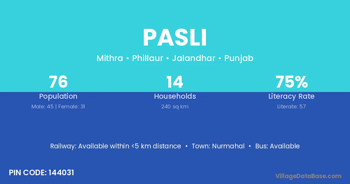 According to Census 2011 information, the village code of Pasli village is 144031.