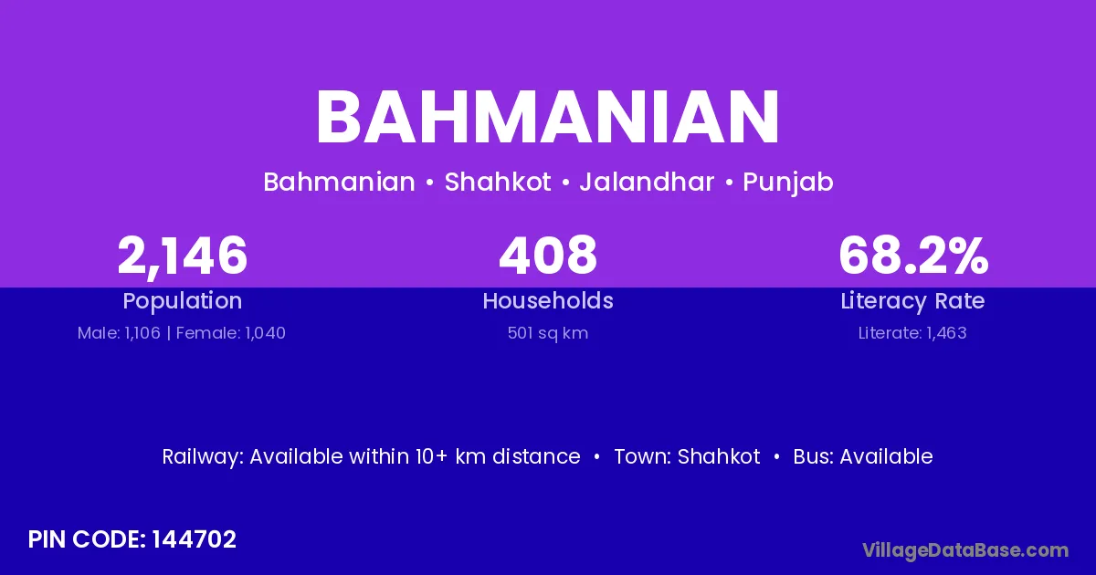 According to Census 2011 information, the village code of Bahmanian village is 144702.