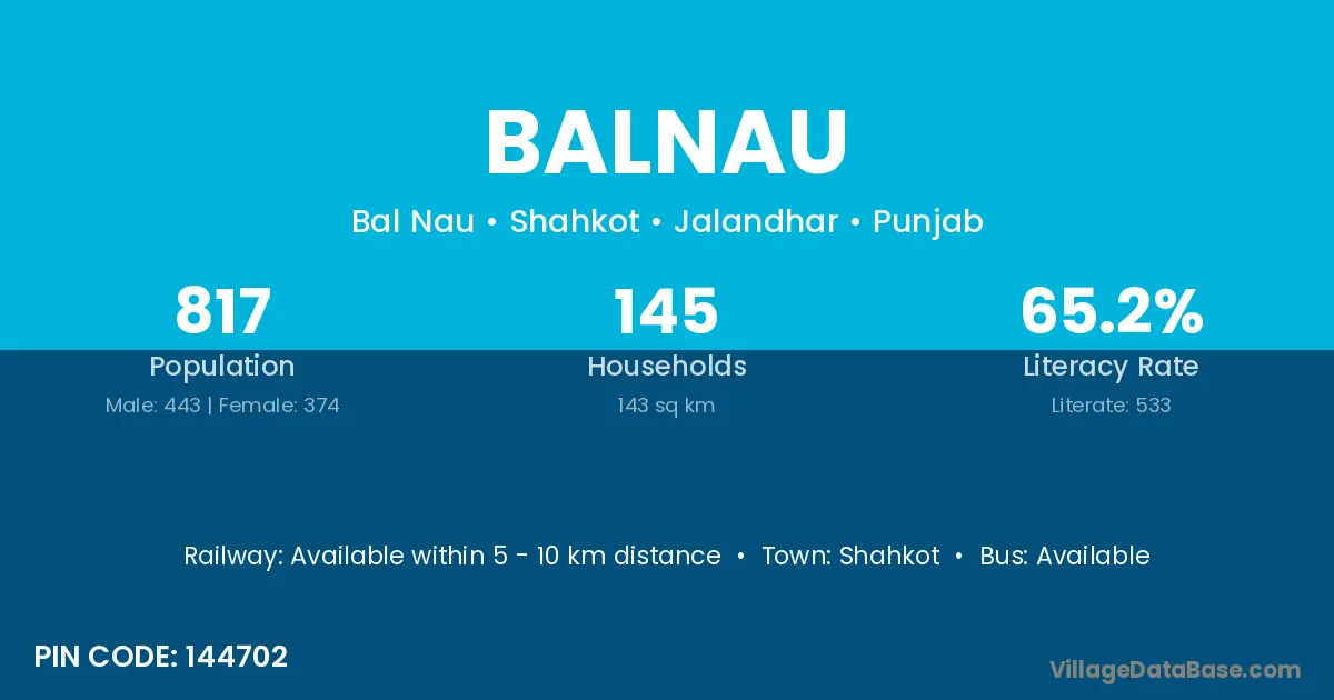Balnau village has a total population of 817 people, of which 443 are males and 374 are females.