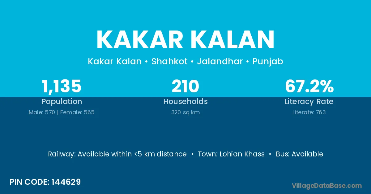 Kakar Kalan village has a total population of 1,135 people, of which 570 are males and 565 are females.