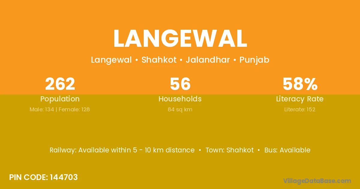 Langewal village has a total population of 262 people, of which 134 are males and 128 are females.