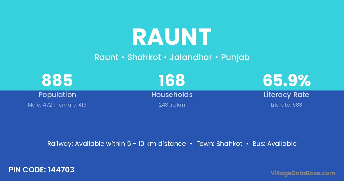 Raunt village has a total population of 885 people, of which 472 are males and 413 are females.