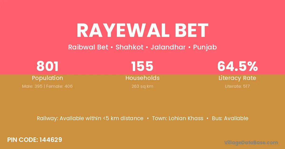 Rayewal Bet village has a total population of 801 people, of which 395 are males and 406 are females.