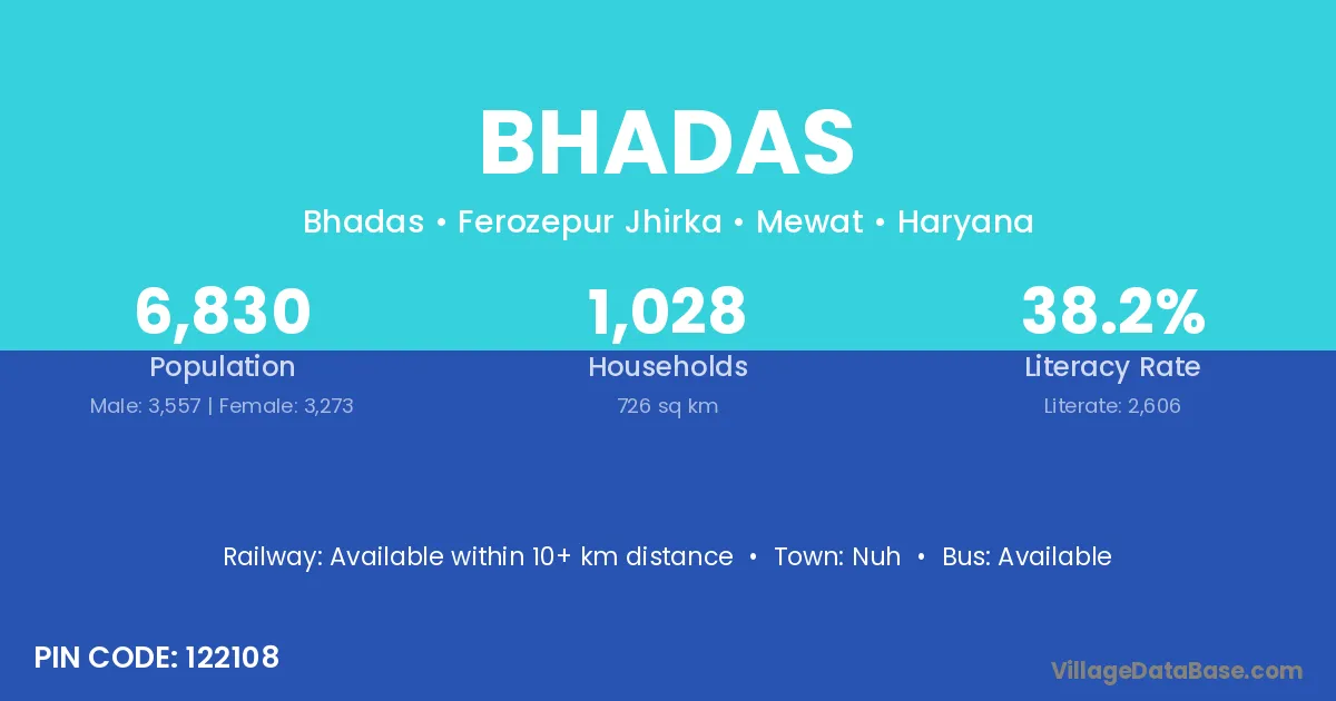 The literacy rate of Bhadas village is 67.42%. Male literacy stands at 70.25% and female literacy at 64.74%.