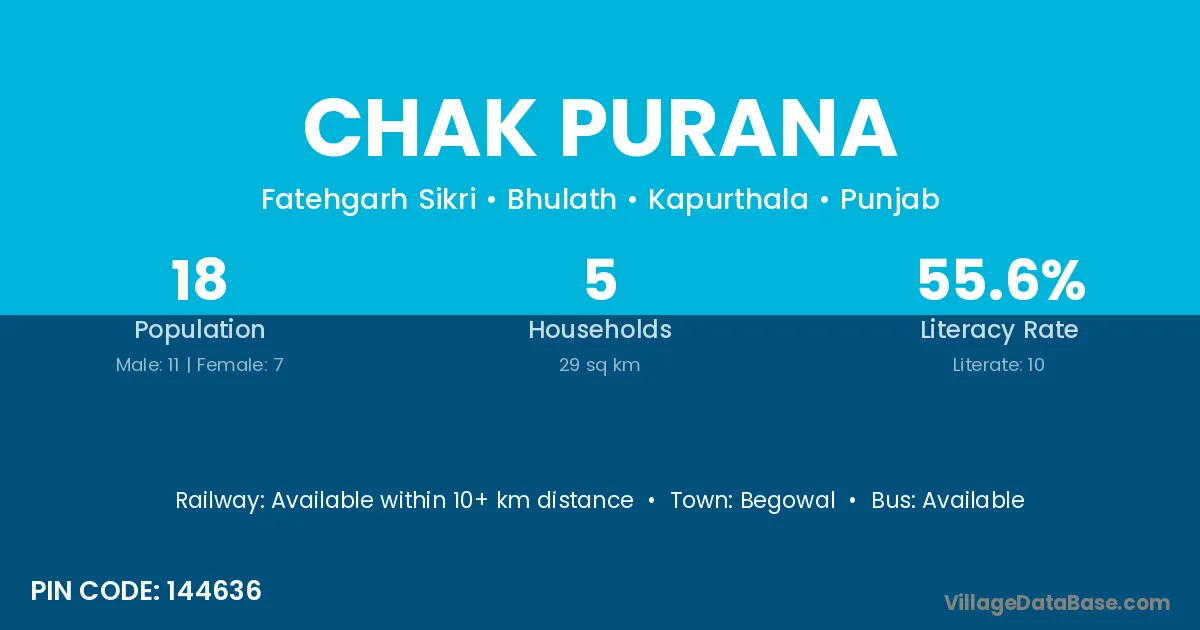 Chak Purana village has a total population of 18 people, of which 11 are males and 7 are females.