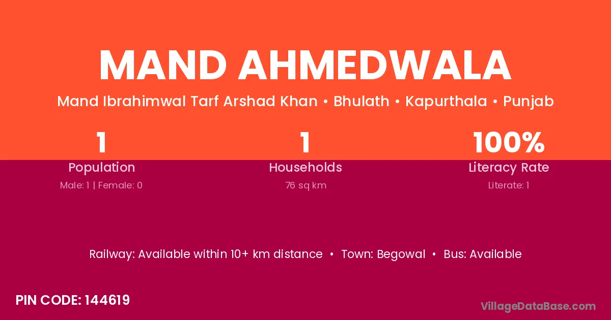 Mand Ahmedwala village has a total population of 1 people, of which 1 are males and 0 are females.