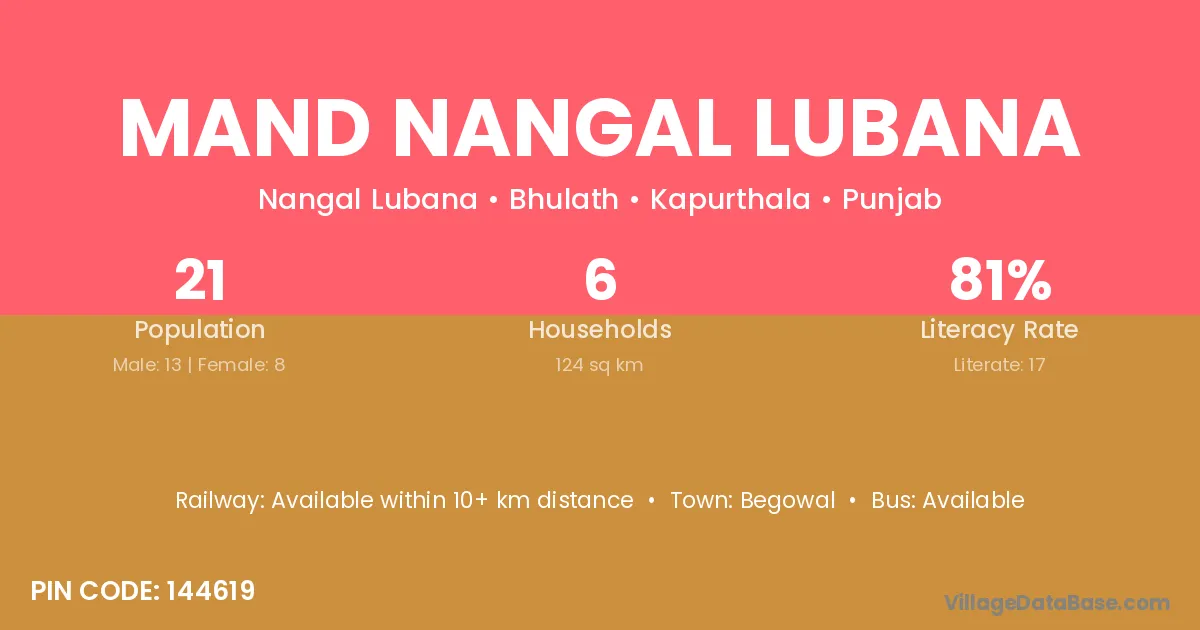 Mand Nangal Lubana village has a total population of 21 people, of which 13 are males and 8 are females.