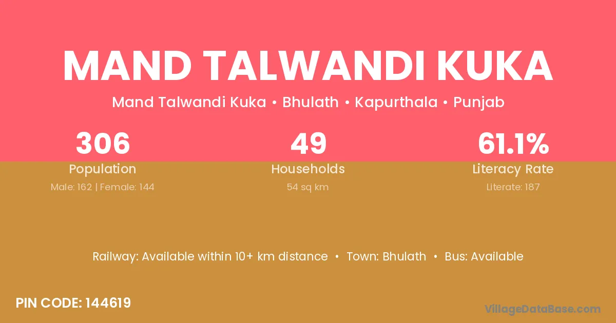 Mand Talwandi Kuka village has a total population of 306 people, of which 162 are males and 144 are females.