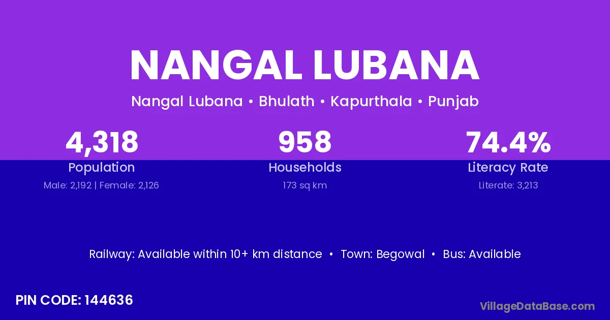 Begowal is the nearest town to Nangal Lubana village for major economic activities