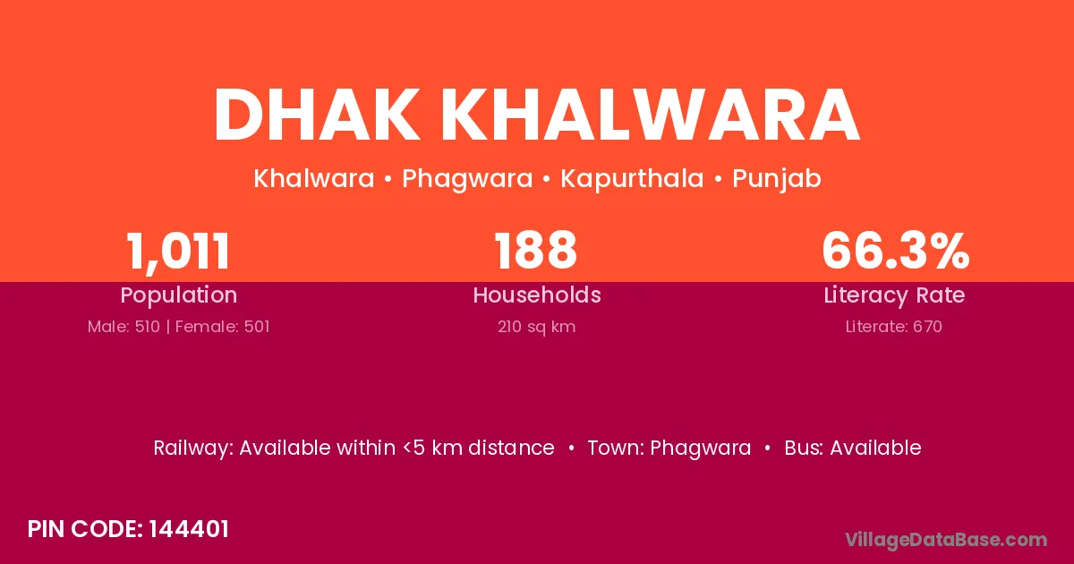 Dhak Khalwara village has a total population of 1,011 people, of which 510 are males and 501 are females.