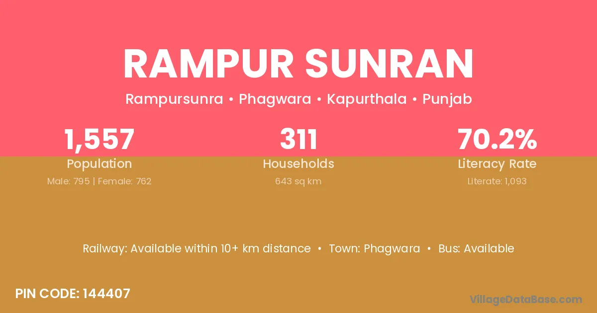 Phagwara is the nearest town to Rampur Sunran village for major economic activities