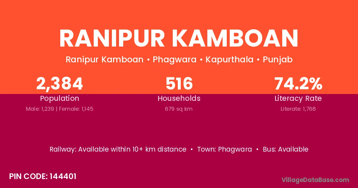 Ranipur Kamboan village has a total population of 2,384 people, of which 1,239 are males and 1,145 are females.