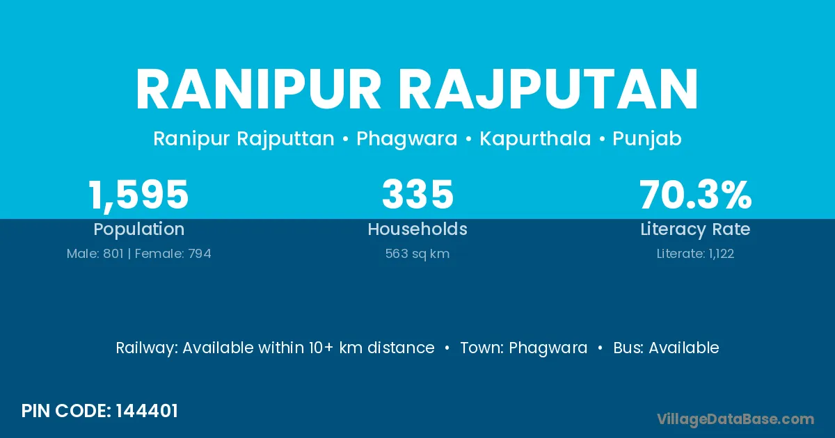 Ranipur Rajputan village has a total population of 1,595 people, of which 801 are males and 794 are females.