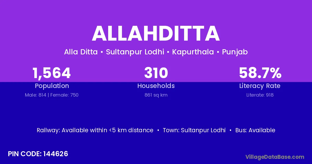 According to Census 2011 information, the village code of Allahditta village is 144626.