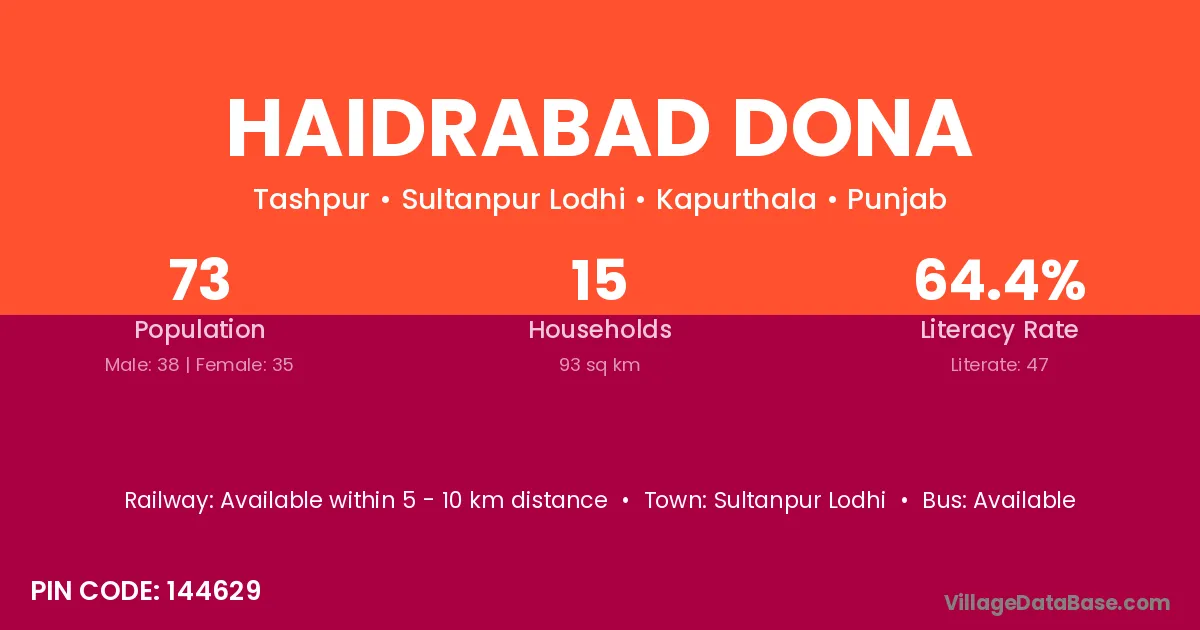 Haidrabad Dona village has a total population of 73 people, of which 38 are males and 35 are females.