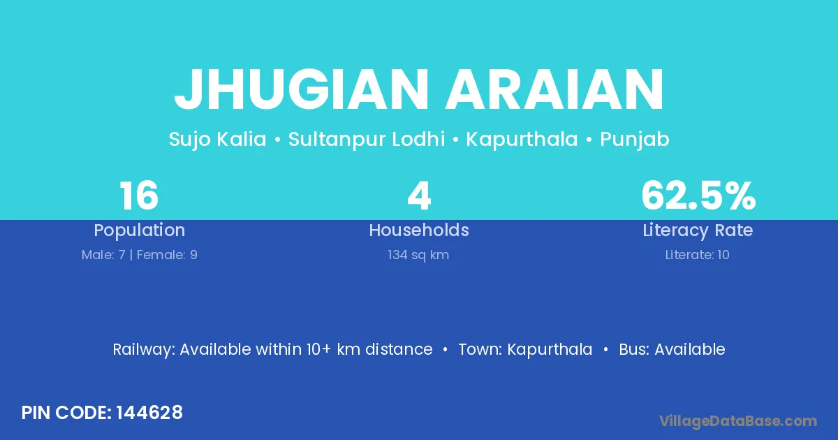 Jhugian Araian village has a total population of 16 people, of which 7 are males and 9 are females.