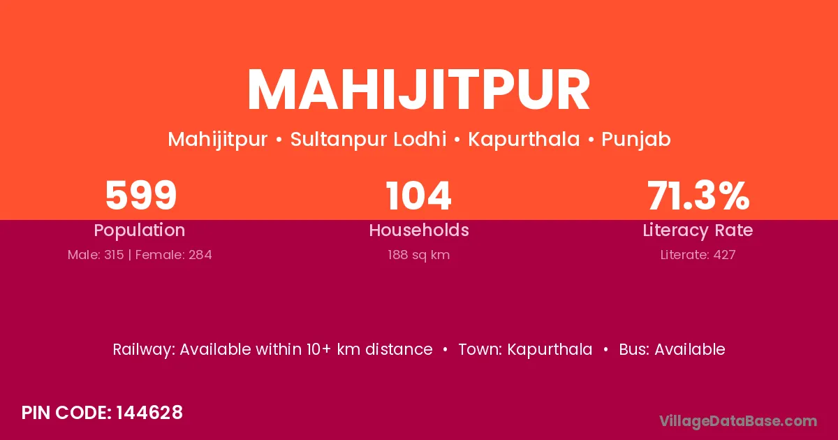 Kapurthala is the nearest town to Mahijitpur village for major economic activities