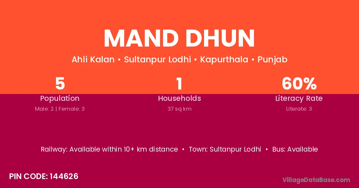 Mand Dhun village has a total population of 5 people, of which 2 are males and 3 are females.