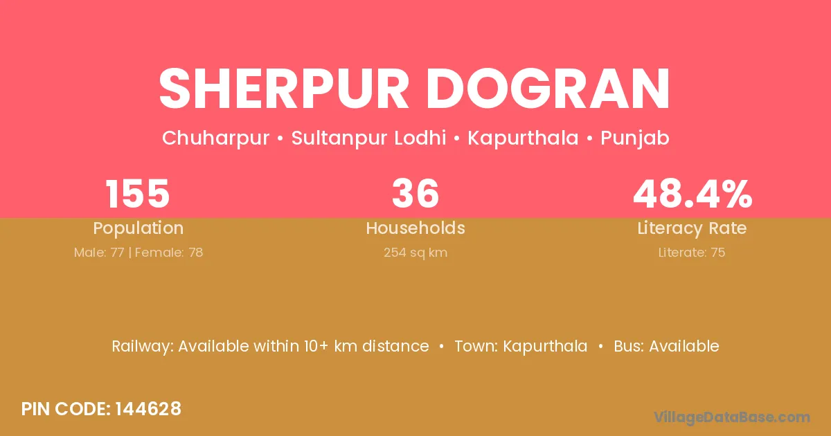 Sherpur Dogran village has a total population of 155 people, of which 77 are males and 78 are females.