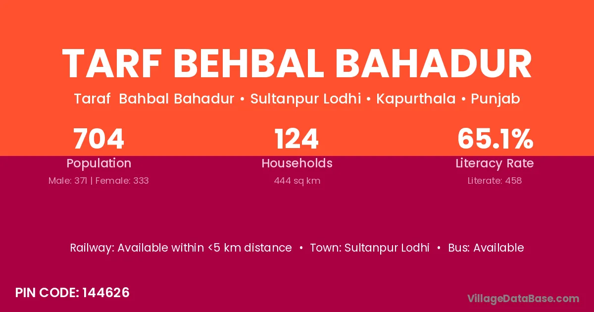 Tarf Behbal Bahadur village has a total population of 704 people, of which 371 are males and 333 are females.