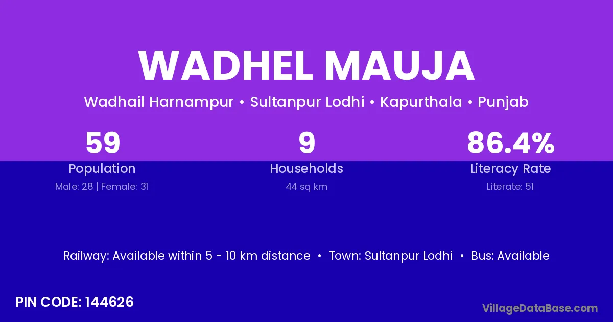 Wadhel Mauja village has a total population of 59 people, of which 28 are males and 31 are females.