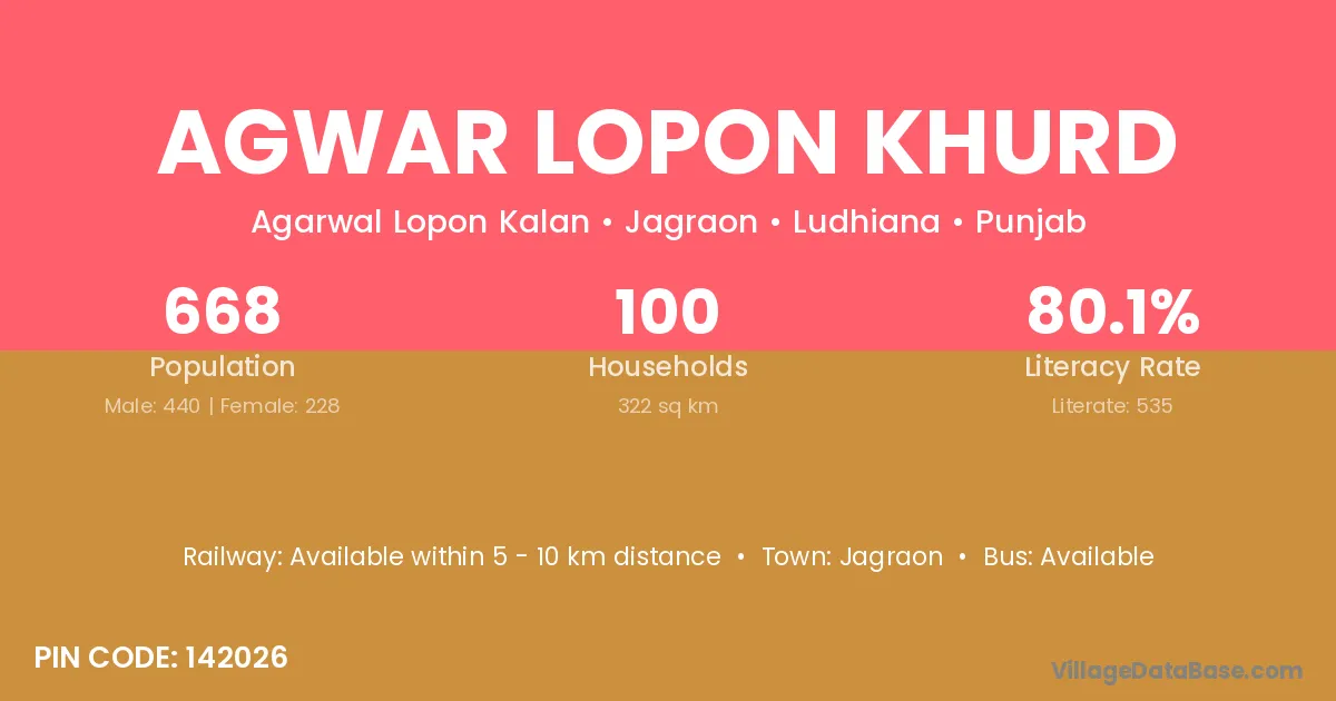 Agwar Lopon Khurd village has a total population of 668 people, of which 440 are males and 228 are females.