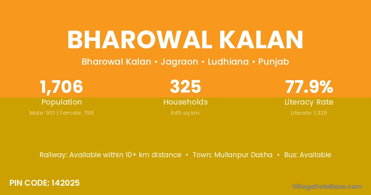 Bharowal Kalan village has a total population of 1,706 people, of which 910 are males and 796 are females.