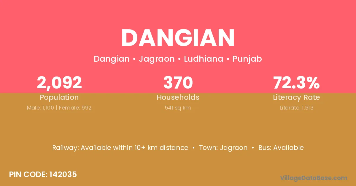 Dangian village has a total population of 2,092 people, of which 1,100 are males and 992 are females.