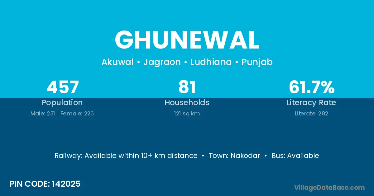 Ghunewal village has a total population of 457 people, of which 231 are males and 226 are females.