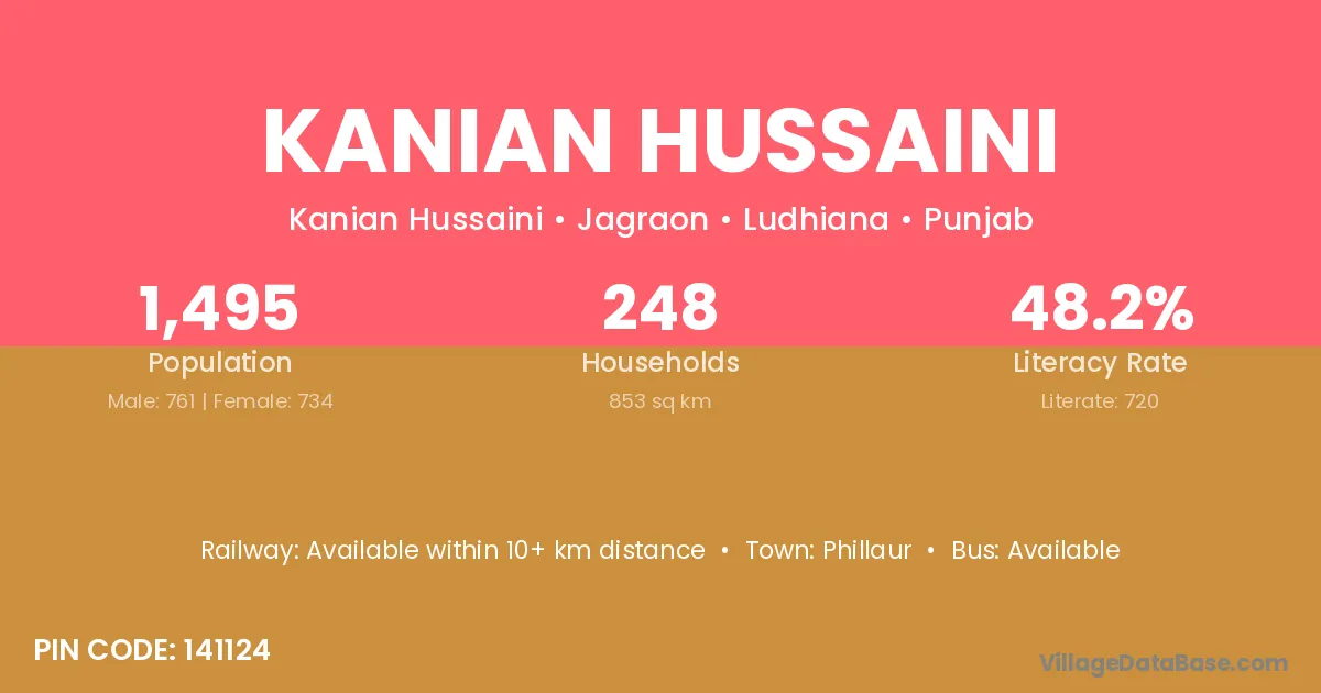 Kanian Hussaini village has a total population of 1,495 people, of which 761 are males and 734 are females.